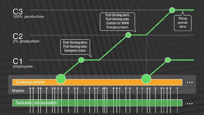 2016年4月,我们决定将 facebook.com 移到一个准持续的“push-from-master”系统上。在接下来的一年里,我们逐渐把它推出,首先让50%的员工用上新代码,然后让0.1%的生产环境用上新代码,再到1%,再增加到10%。这些进程中的每一步都是对我们的工具和过程的测试,测试它们处理日益增加的推送频率的能力,从而得到真实的反馈。我们的主要目标是确保新系统能让人们的体验更好——或者至少,不会让它变得更糟。经过了几乎整整一年的规划和开发之后,在2017年4月的3天内,我们使100%的生产环境能够运行直接从master部署的代码。