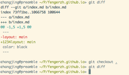 可以看到,在执行完 git checkout . 之后,修改已被撤销, git diff 没有任何内容了。