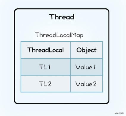 实际上Java的实现是下面这样,Java 的实现里面也有一个 Map,叫做 ThreadLocalMap,不过持有 ThreadLocalMap 的不是 ThreadLocal,而是 Thread。Thread 这个类内部有一个私有属性 threadLocals,其类型就是 ThreadLocalMap,ThreadLocalMap 的 Key 是 ThreadLocal。