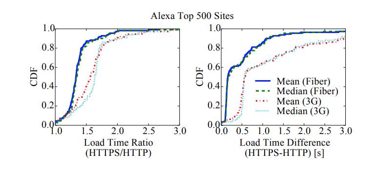 由上图可以明显看出,在3G环境下,90%的网站HTTPS的额外延迟大于500ms.在有线网络下的延迟小一点,但是仍然有40%的使用HTTPS的网站需要额外加载多于500ms.