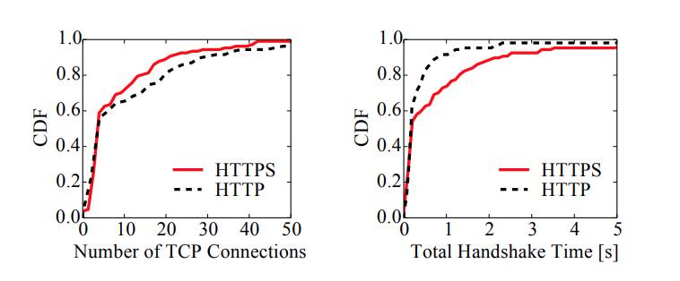 那么是什么原因导致HTTPS的加载时间更长呢?作者通过收集每个页面的HTTP请求/响应信息(HAR)发现如下图,虽然相比于HTTP,40%的网站加载HTTPS时,建立更少的TCP连接;但是,接近一半的网站在建立TCP连接时,每一次握手却需要耗费更多的时间,这部分时间主要是由TLS引起的协商开销。因此,HTTPS的加载时间反而更长。
