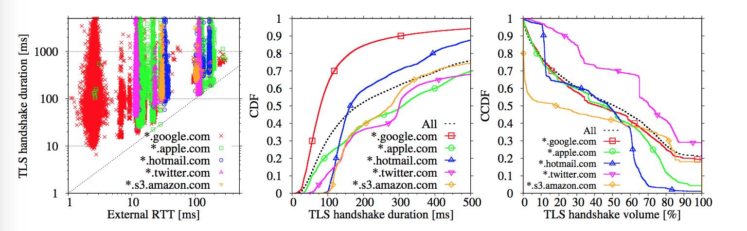 所以不难发现,HTTPS的开销与TLS握手的延迟带来的开销息息相关,但是此时还不能排除使用HTTPS协议的网页加载时间长短是否和网络状况的好坏有关。为了更好地了解其中的原因,作者修改了Tstat,并让Tstat从2014年4月3日由RES-ISP收集的一小时pcap踪迹数据,约有100万个TLS流量中提取(i)持续时间和(ii)每次TLS握手的字节数。作者选取了美国几个具有代表性的网站进行实验。通常我们认为,网络延迟的长短与客户端和服务器的之间的远近有关,因此作者引入外部的RTT来表示上述距离,当RTT大于100ms的时候表示服务器已经在欧洲之外了。然而在实验中发现,即使是客户端与服务器的距离很近,TLS握手的持续时间仍然很长(如下图左边),以TLS协商延迟最小的Google为例(如下图中间),大约90%的TLS握手持续时间在300ms以内,10%超过300ms。由此可以看出一个完整的TLS握手请求时间至少是RTT的2倍以上,由此不难发现TLS握手请求为服务器带来的巨大额外开销。一般来时,可能由于客户或服务器开销,或网络拥塞,或缓慢的OCSP认证,5%的请求一般都会经过一个时长是RTT的10倍的握手。
