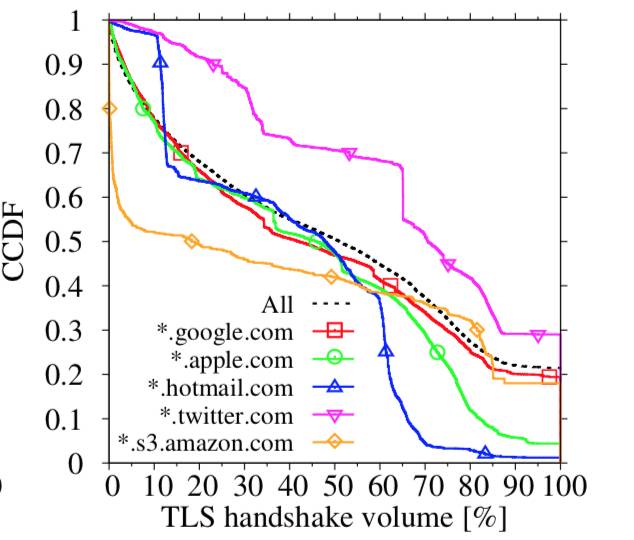 上图展示了各大网站中TLS握手包所占的量。我们发现,大多数TLS的连接都处于非重度使用的状态,事实上,这些连接中有一半都是TLS握手包占总的包大小的42%以上。当然,也有一些服务是非常高效率的,他们重度使用TLS的连接,例如Amazon S3,这相对地减少了在协商阶段的消耗。也有一些服务是会在真正发送数据时选择使用“预打开”连接,这掩盖了一些对延迟的影响。因为在这种情况下,如果连接没有被真正的使用,TLS的开销就会占到总开销的100%。