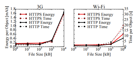 上图展示了在不同情况下完成一次下载的平均时间和电量的消耗情况。很明显,电池电量和下载时间是相关联的。而且,对于一些大文件,在Wi-Fi情况下的开销是比较明显的(相对于3G情况下),但造成这一点的原因尚不明确。总的来说,除去下载时间不同之外,HTTPS中的加密对电池的影响是几乎没有的。