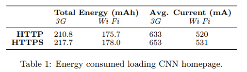 作者使用了一部带电表的Galaxy S II,将亮度调至最低,每200微秒测量一次电力消耗。用这部手机通过3G及Wi-Fi下载从1KB-1MB的合成的内容。每个内容都会分别使用HTTP和HTTPS下载100次。值得注意的是,作者在Android上编译了curl,以避免无关的影响。
