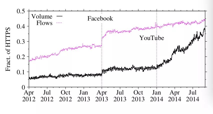 上图展示了从2012年4月到2014年9月的HTTPS流量变化,HTTPS流量的增长是惊人的:在两年间就增长了超过2倍。到了2014年的9月,44.3%的网络连接都已经使用了HTTPS。