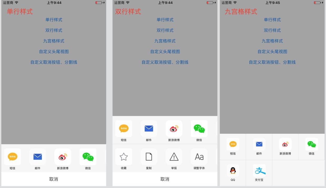 除了第一种方案UIActivityViewController不需要自己绘制界面以外,其他方案均要自己绘制分享弹出菜单,针对以上问题,我写了一个界面和功能高度可定制化的轮子IFMShare(Swift版)供大家使用。