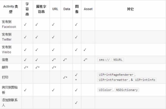 activityItems是要分享的内容,包括文字、图片、网址。但是要注意的是,不是所有平台都支持这三种内容的分享,例如微信,不能同时分享图片和网址,文字不能直接往外分享,下图是几个平台分享概略