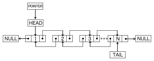 声明变量 HEAD, TAIL, POINTER & length 分别指代「头指针」,「尾指针」,「游标指针」和 「链表长度」,那么构建一个双向链表如下伪代码: