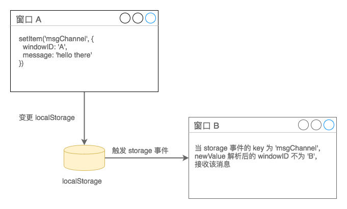 其实原理也简单,每次 localStorage 中有任何变动都会触发一个 storage 事件,所有窗口都监听这个事件,一旦有窗口更新 localStorage,其他窗口都会收到通知,根据事件中的 key 把不关心的变动过滤掉。原理是很简单,但是要实现一套完整的广播机制还是有些复杂,你需要:
