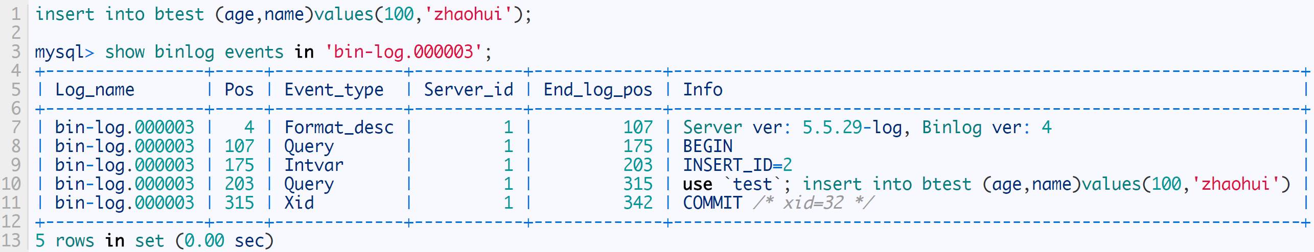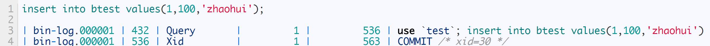 支持XA的存储引擎才有,本地测试的数据库存储引擎是innodb,所有上面出现了XID_EVENT;innodb事务提交产生了QUERY_EVENT的BEGIN声明,QUERY_EVENT以及COMMIT声明,