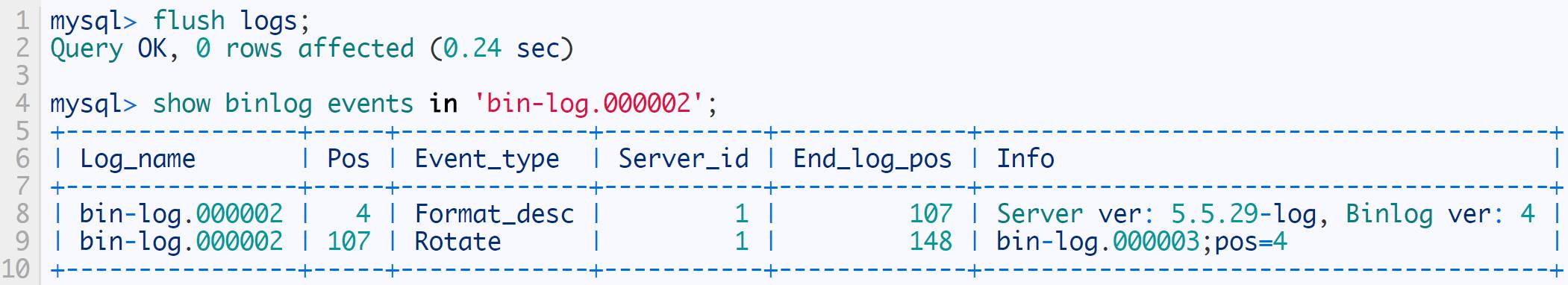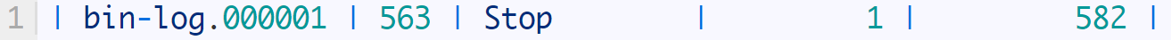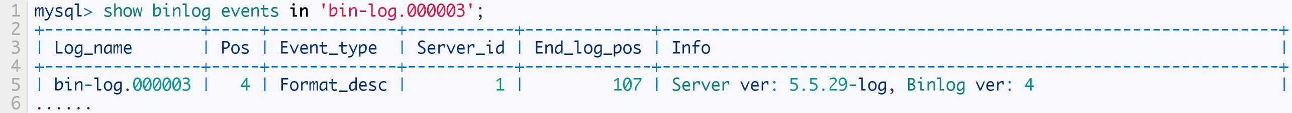 | Log_name | Pos | Event_type | Server_id | End_log_pos |Info |