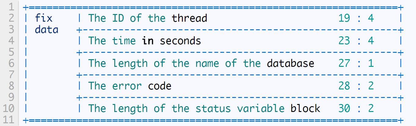 Format_desc_Event位置是15,可以在图中找到15的位置是0x54,对应十进制是84,即fixed part lengths=84,而这个值刚好是57+27=84,所以Format_desc_Event不存在variable part;