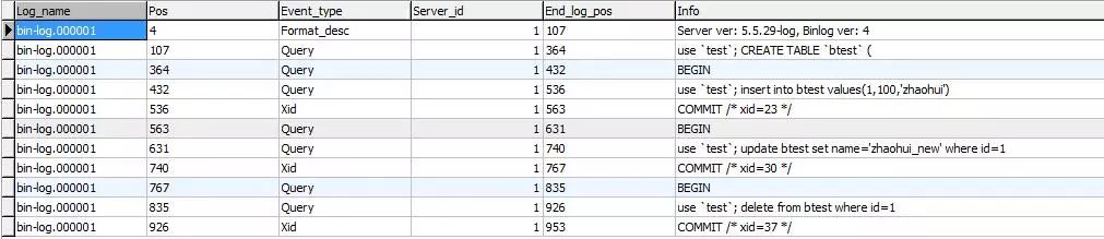 | Log_name | Pos | Event_type | Server_id | End_log_pos | Info