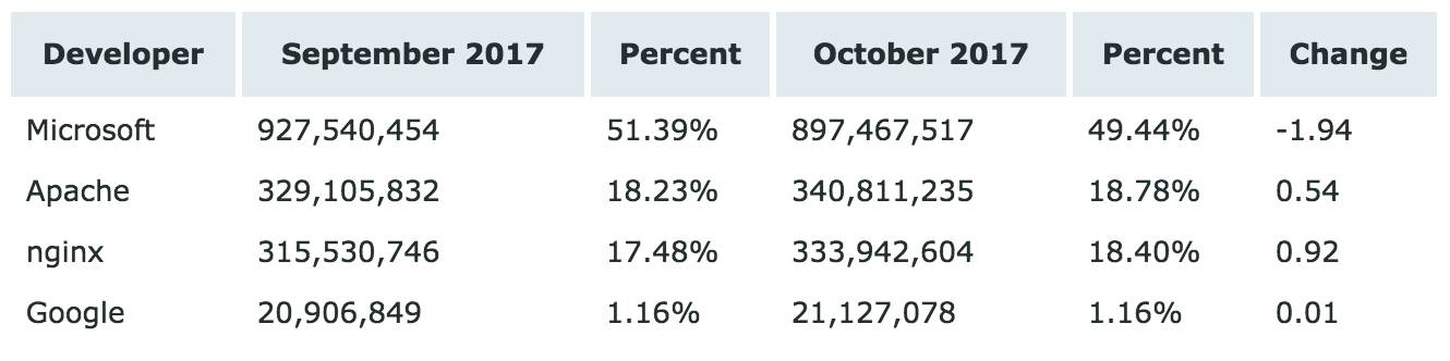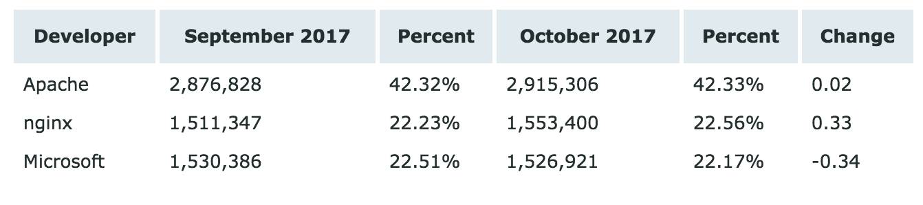 Netcraft 发布了2017年10月 Web 服务器调查报告,排名前三的依然是 Microsoft、Apache 和 nginx 。