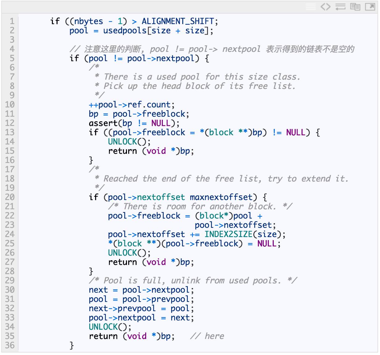 init获得的情况, 其实就是将刚刚从arena中获取的pool加入到 usedpools 对应的双向链表中, 然后初始化, 然后返回block