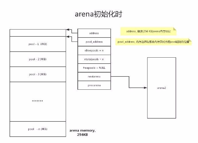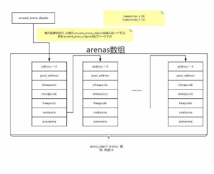 arena_object和其管理的内存是分离的 => arena_object被申请时, 其管理的pool集合的内存没有被申请, 而是在某一时刻建立的联系