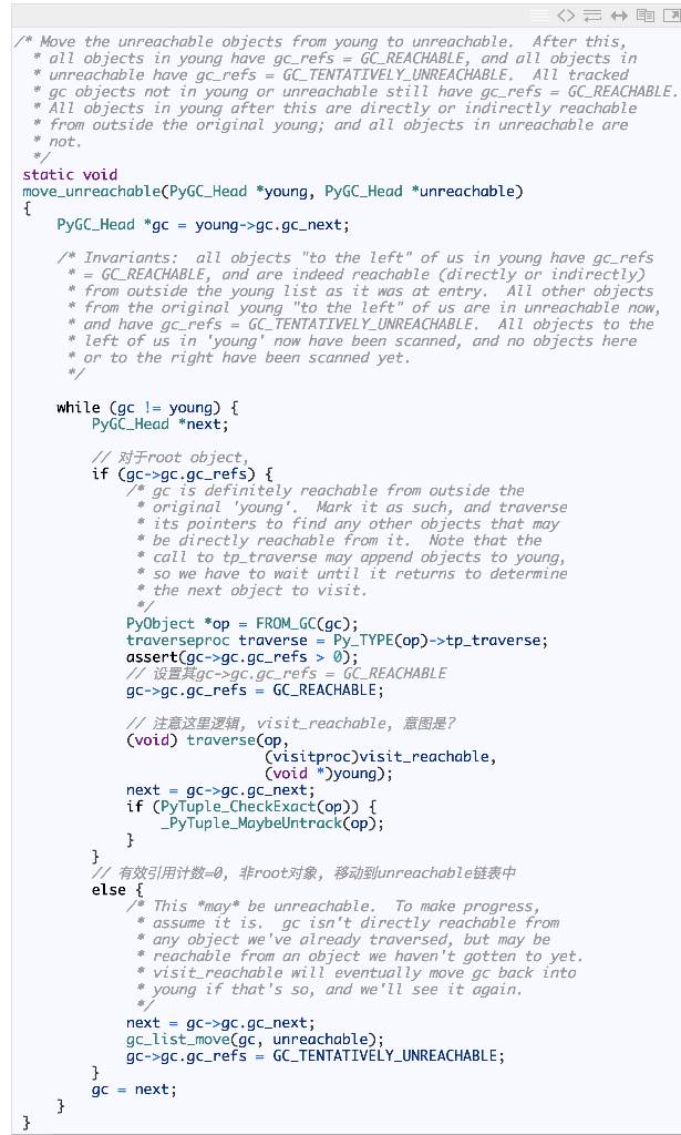 move_unreachable, 将可收集对象链表中, 根据有效引用计数 不等于0(root对象) 和 等于0(非root对象, 垃圾, 可回收), 一分为二