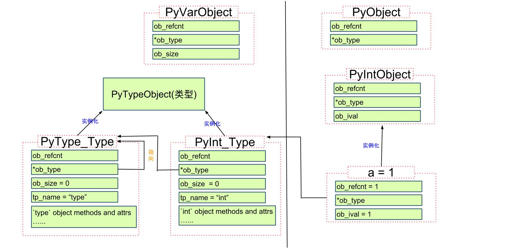 注意: 无论任何时候, ob_type指向的是 PyTypeObject的实例: PyType_Type/PyInt_Type…
