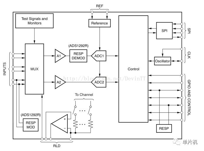 1、两个低噪声可编程增益放大器器(PGA)和和两个高分别率模数转换器器(ADC),集成了心电采集所需要的部件,方便设备小型化。