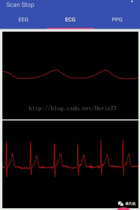 最后通过蓝牙发送到手机编写的APP中,画图显示波形。上图是呼吸波,下图是心电。由于没有使用右腿驱动,噪声略微明显。