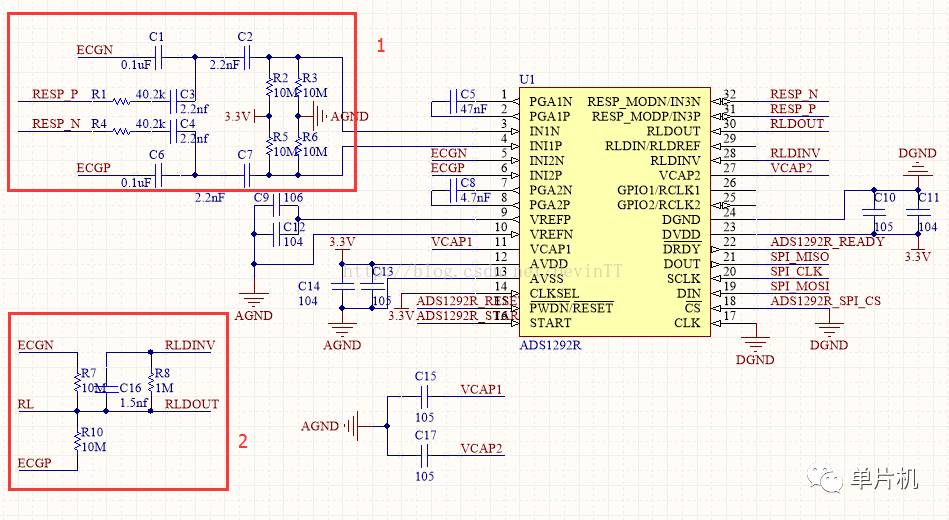 图中部分电路1是呼吸检测的滤波电路。呼吸检测是使用了阻抗检测的方法,使用了的32KHz(或者64KHz)高频方波输入到人体,然后经过电路滤波后可以计算出两片电极之间的阻抗变化的大小。这里有趣的是呼吸检测和心电检测使用的是同一电极,由于心电信号一般在100Hz下,对于高频的检测呼吸的方波是可以通过ADS1292R里面EMI电路滤掉的。