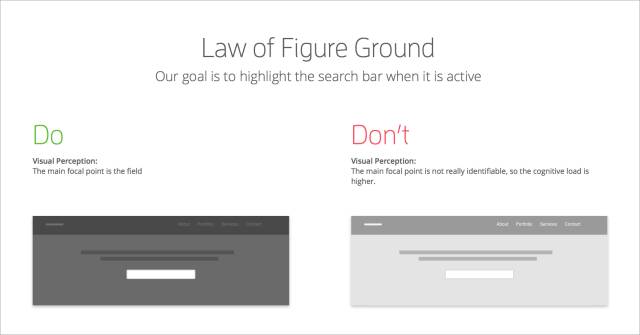 「主体 / 背景法则」表明“元素视为文字(不同的重点)或区域(文字后面的背景)间的对比”,由Andy Rutledge提出。当我们想要在屏幕中强调某点的时候这条非常有用。