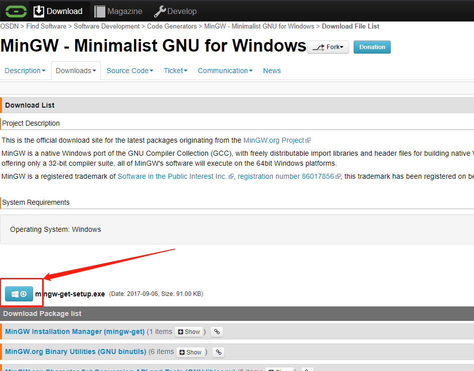 访问MinGW官网下载页面:https://osdn.net/projects/mingw/releases/